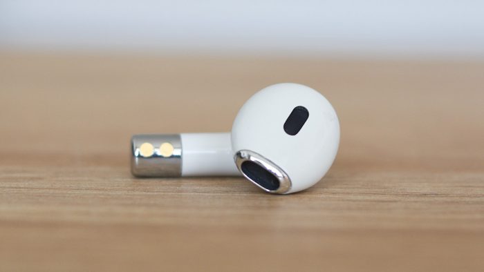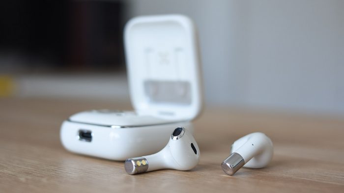 耳机保持与仓体一致的乳白色配色,采用半入耳式加耳机柄的结构,耳机柄部分比较短,官方称其为短柄流体设计。耳机柄末端加入了一段银色的拼接设计,与收纳仓外面的设计手法相呼应,金属充电触点设计在银色拼接部分的内侧,同时在耳机柄外侧中间的部分预留有指示灯。