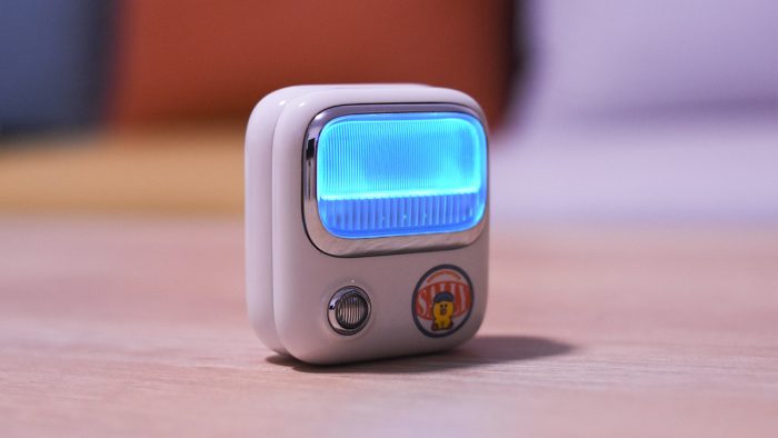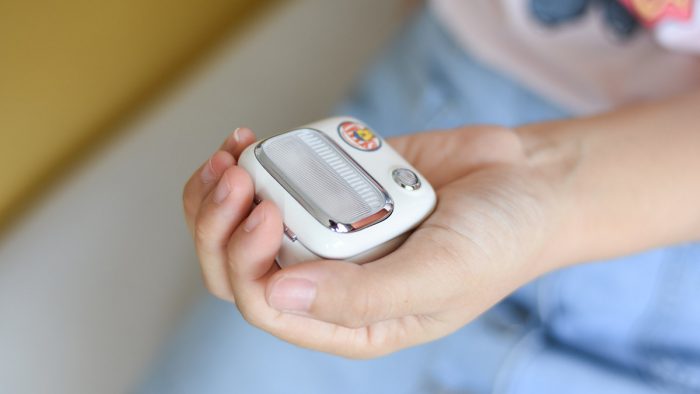 下方左侧的按实体按键也融入了复古的元素,按键表面的处理风格与上面的视窗基本一致。按键单击指示灯亮起,显示电量状态;长按两秒钟可以开启和关闭上方视窗中的炫彩背景灯光,也为收纳盒本身增加了一些有趣的玩法。