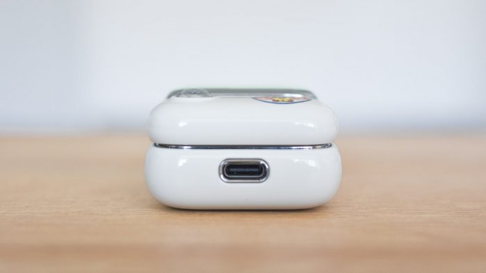 收纳仓背部贴有不干胶标签,标记有这款耳机的技术参数等信息。Type C充电接口预留在机身侧边底部的位置,接口外侧包裹有一圈银色的镶边。