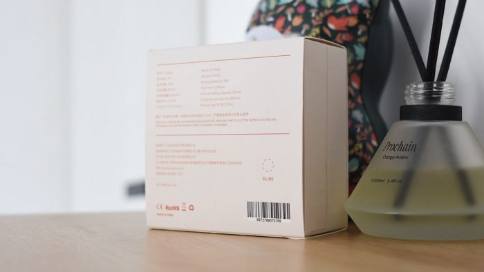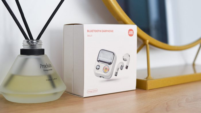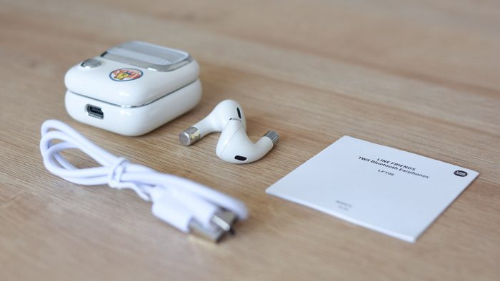 包装方面采用纯白色的格调,正面印有耳机及收纳盒的渲染图,左上标记有蓝牙耳机以及莎莉鸡字样,右上角印有LINE FRIENDS联名标识。