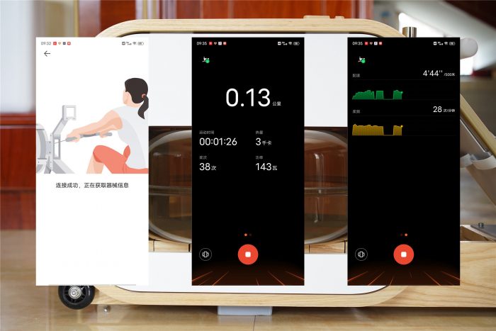 显示“连接成功,正在获取器械信息”基本就完工了,稍等下会出来个蓝牙配对的提示信息,可以选择确定,也可以让APP自动配对,右侧二张图片就是赤兔划船机的页面了,风格非常简洁,只提供了距离、时间、热量、桨次、功率、配速及桨频等7个核心数据。