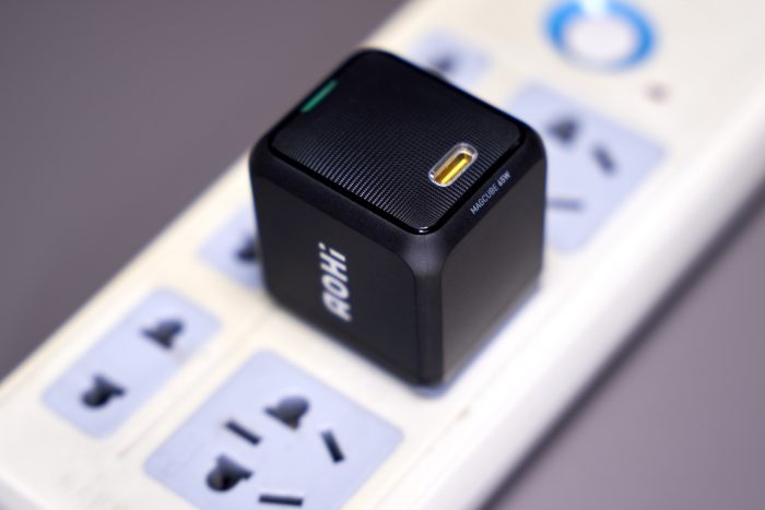 插入插座之后,Aohi奥海快充头的外形更显克制,黑色磨砂外壳上白色的logo很醒目。