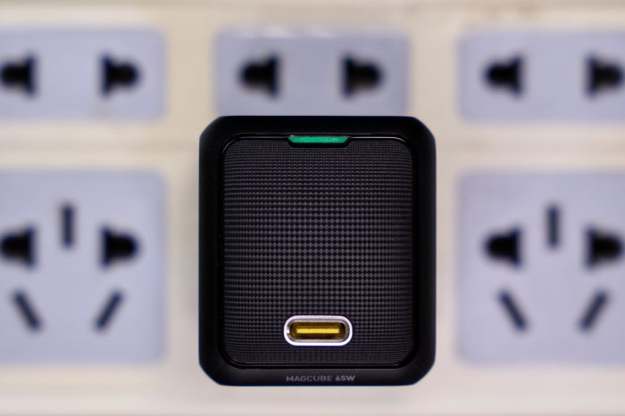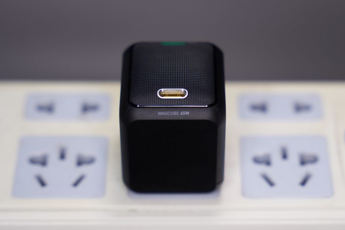 在指示灯对侧,是Type-C(PD)接口,接口周围有银色金属圈保护,且金属圈呈斜面向插口处汇聚。可以说整个顶面的弧度凸起、菱状触感、彩灯指示、斜面插口都是为了黑暗环境下的盲插服务,非常贴心到位。棱边上还温馨提示着“MAGCUBE 65W”。
