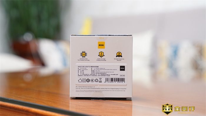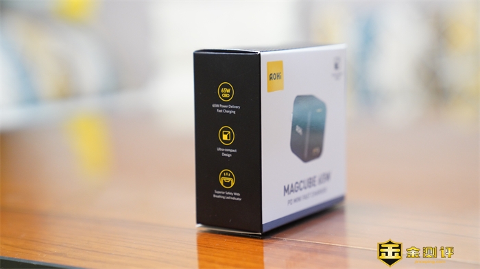 另外,从包装侧面的产品特性介绍我们可以看到,这款充电器提供了65W快充,极其袖珍的外观设计,以及可以保障安全的LED呼吸指示灯。