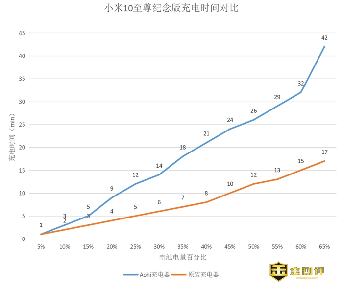 笔者另外使用的一部手机为小米10至尊纪念版,原厂支持120W快充。不过从上图中的比较中大家也可以看到,120W充电器相比这款充电器大了一圈,快充与体积无法兼得。其实在日常使用过程中,65W快充已经可以满足绝大部分使用场景了,因此我们还是对这款充电器的充电效果进行了测试。测试同样由0%开始,不过令笔者比较意外的是,在电量充至65%时,充电模式就自动切换为微电流模式。