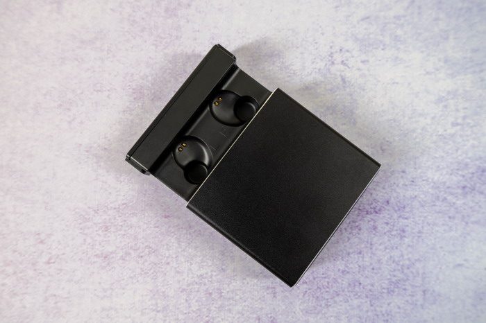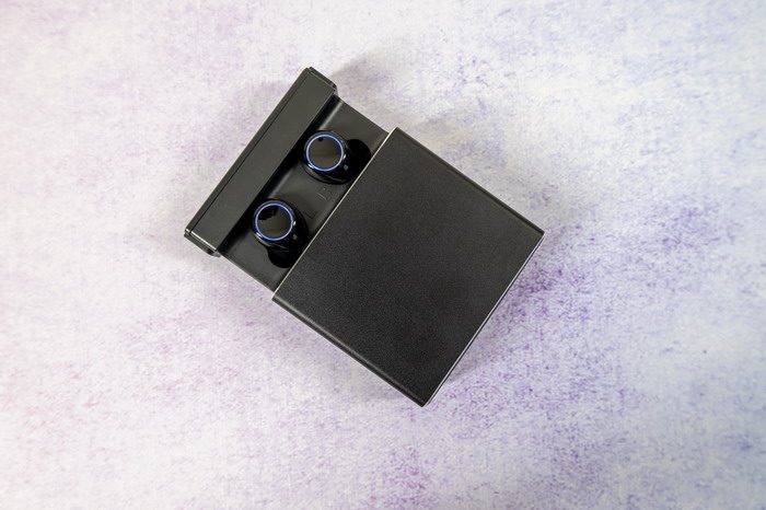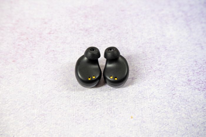 取出耳机后,可以看到底部充电位上有2个金属针脚,这是用来给耳机充电用的。