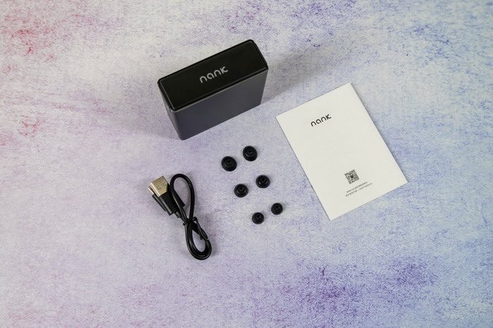 南卡N2S真无线蓝牙耳机的包装盒内含有:南卡N2S真无线蓝牙耳机+充电仓,3对不同大小硅胶耳塞帽,Type-C 充电线,以及使用说明书。
