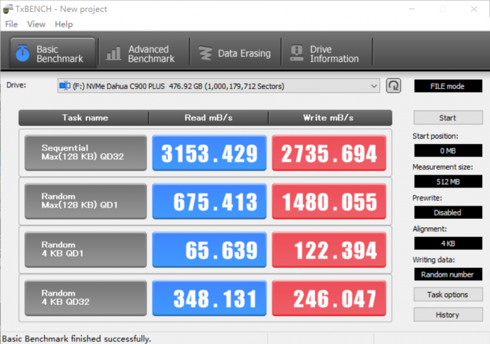 TxBENCH测试成绩(这是一款来自国外的游戏测试软件),读取和写入速度分别是3153MB/s及2735MB/s,从这里也可以看出大华C900 PLUS的测试速度相当给力。几款软件轮番上阵后,大华C900 PLUS测试结果都比较接近,特别是写入速度,比官方参考值整整高了10-20%左右。