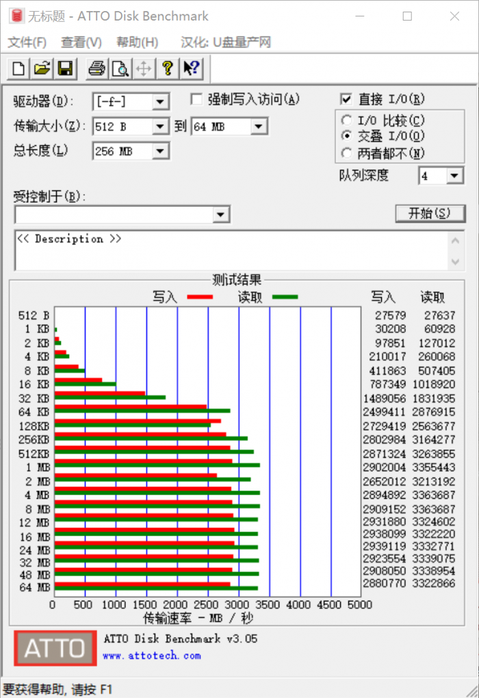 ATTO磁盘基准测试是一款专业实用的磁盘速率测试软件,操作简单。可轻松对硬盘进行读取速度和写入缓存速度的检测,检测好的结果会直接显示在软件界面供用户查看。测试结果显示,在块大小为256KB时,大华C900 PLUS的性能开始显现,到1MB时开始趋于稳定,写入最高速度达到3322MB/s,读取最高速度达到2880MB/s,稳定性及性能表现都非常不错。