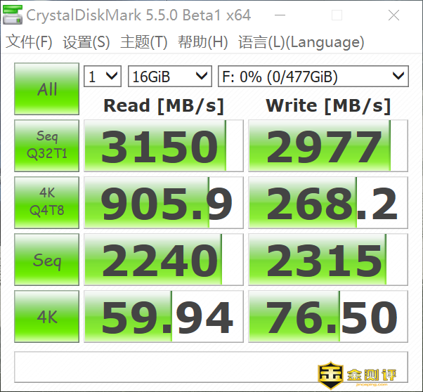 先用CrystalDiskMark测试了下,读取速度为3150MB/s,写入速度2977MB/s,官方参考数据读取3200MB/s,写入2500MB/s,两者对比后不难发现,读取速度比较接近,误差小于2%,读取速度比官方数据多了整整477MB/s,已经快要接近1TB版本的官方参考数据。