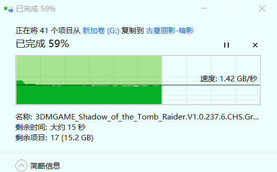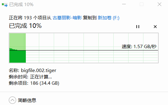 古墓丽影-暗影文件包解压后生成193个文件,文件大小38.3GB。小文件多了后,速度曲线虽然有点轻微波动,但是没有出现大范围及断崖式下降的情况,曲线波动都在合理范围内,传输速率基本大文件传输相差不明显。实际使用时,开机速度相比原来硬盘大概有2秒左右的提升(当然也不排除新装系统,硬盘比较干净的原因)。