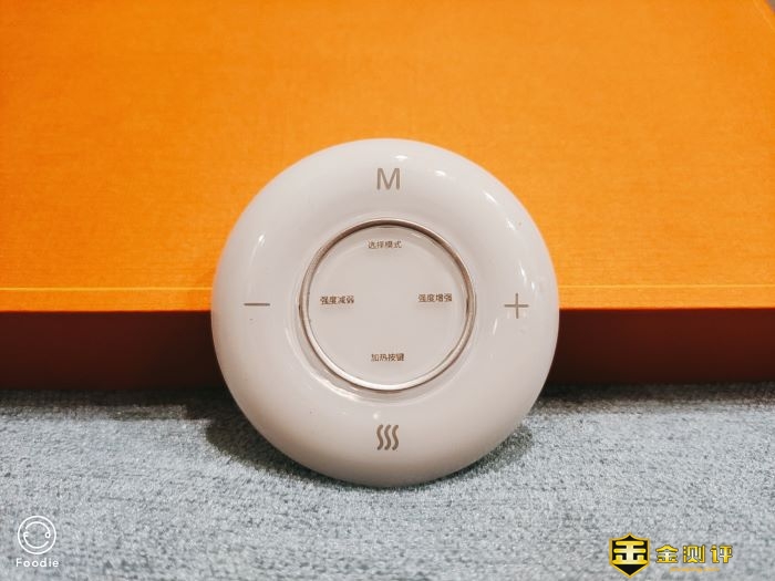 控制器的正面是有一种陶瓷质感的光泽,虽然其实也是塑料材质,中间有一圈仿金属质感的圆圈,看起来会有时尚感觉。上下左右简单的四个按键,分辨是模式键、加热键、减弱键和增强键。