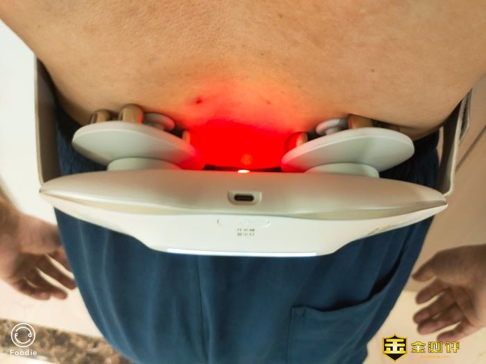 12个按摩头左右排列,呈现莫比乌斯环的设计观感,能够完美贴合人体曲线。左右与分别是4个椭圆形指压推揉按摩头,一个长条年糕型脉冲按摩头,和一个腰子形肾俞穴专用穴位按摩头。正中间是红色脉冲加热条。