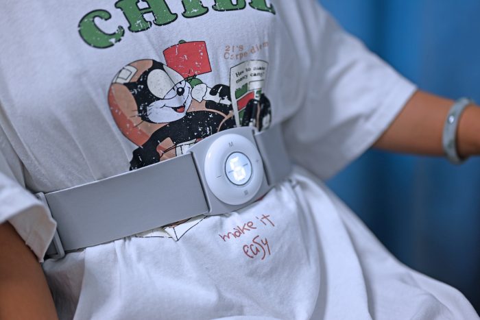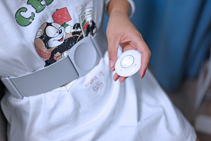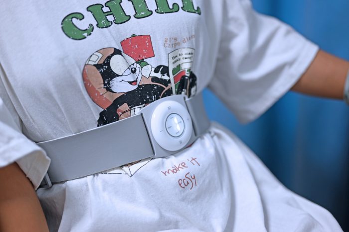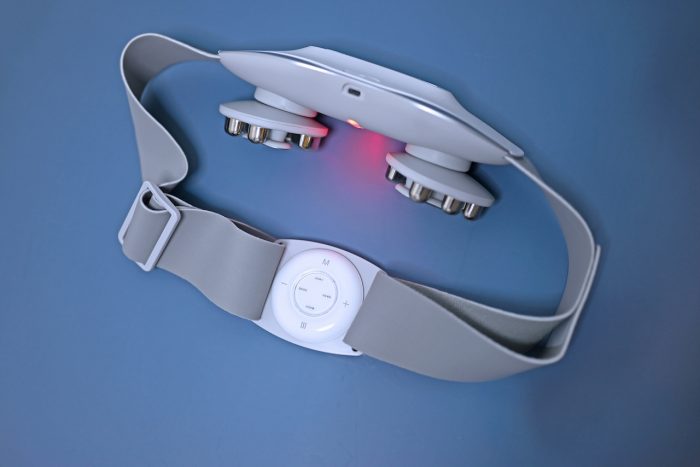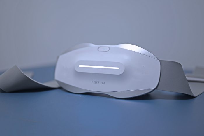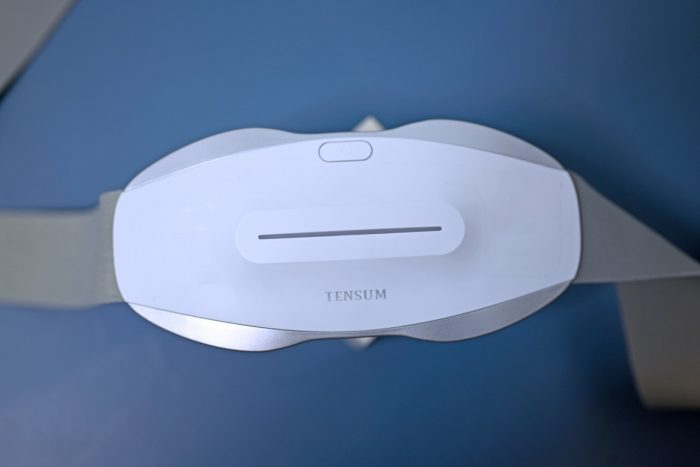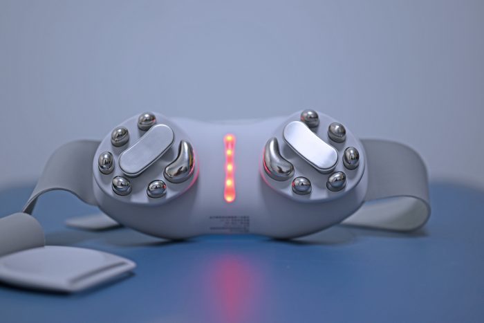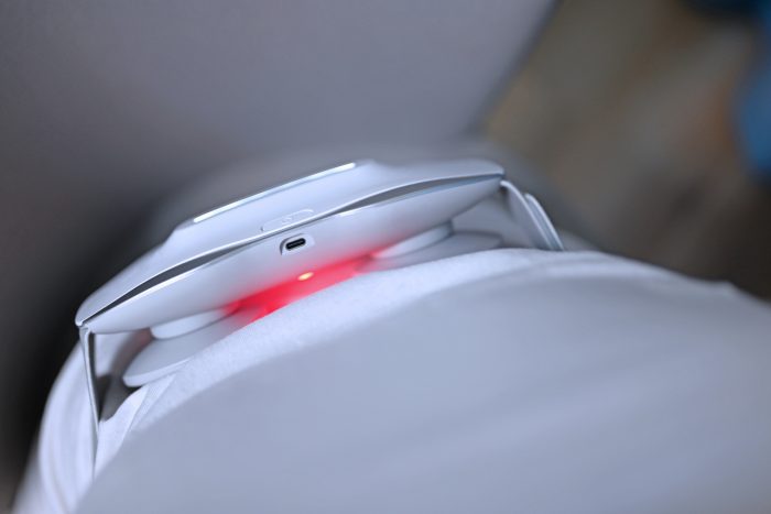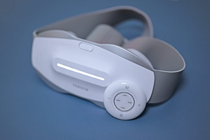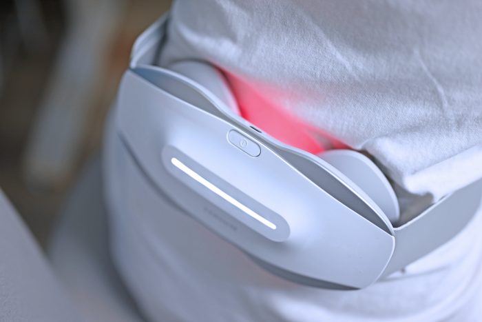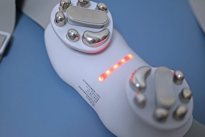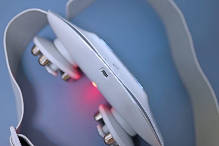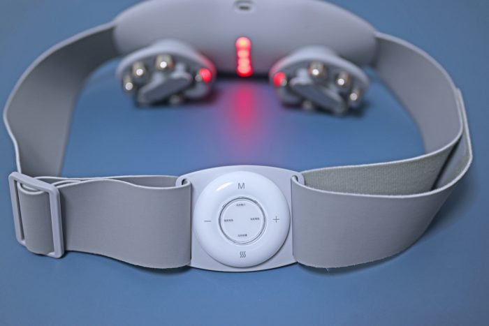 按摩器贴近身体的一侧使用了亲肤的材质,摸着手感很舒服,正中间是光子理疗灯。