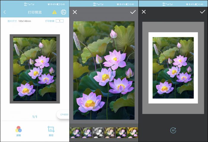 选择好打印照片就可以在打印预览界面里设置打印数量、选择滤镜、裁剪和90°旋转图片操作,最后再选择右上角的打印机图标,打印就自动开始了。