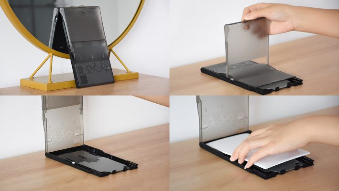 附赠的纸匣和多数打印机的送纸盒类似,黑色半透明的塑料盒子。上面的盖板分两段式打开,第一段打开以后用于和打印机连接,第二段可以完全打开,才能放进去相纸。附赠的相纸也是汉印自家的纸,正面的光泽度还不错,只是稍微薄了些。