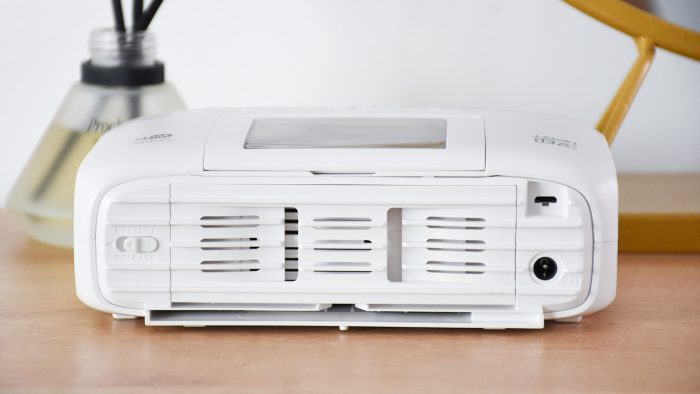 机身背部中间是一块散热格栅,右边预留了Micro USB接口和DC电源接口。底部的一条比较宽的槽是出纸槽,由于机身空间有限,打印期间照片会从这个位置出来。