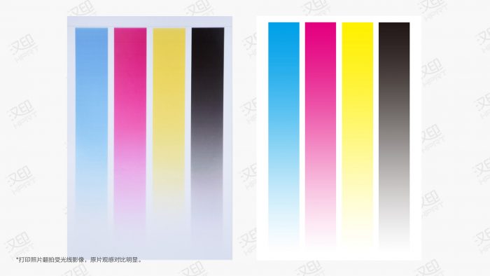 另外我打印了青品黄黑四色的色阶过渡图,观察可以看到不同颜色之间的过渡非常自然平顺,没有出现色块、断续或者跳色的现象,这也足以说明它的着色效果很出色。