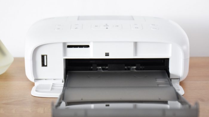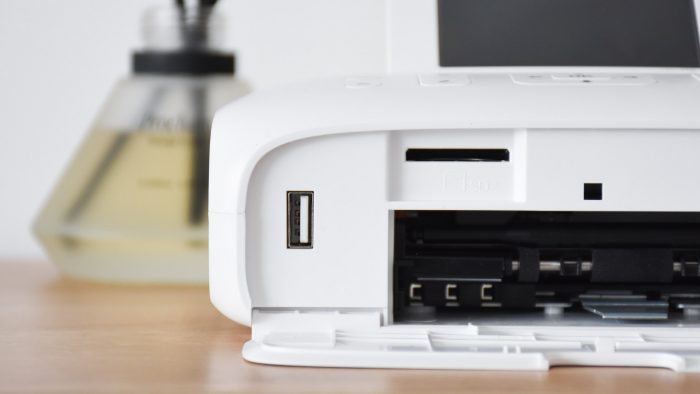 机身靠里面的一侧的仓门可以打开,用于安装纸匣,观察发现里面有进纸轮等零部件。另外,左边预留有USB接口,靠上方有SD卡插槽,可以直接读取外置存储设备上的照片文件。