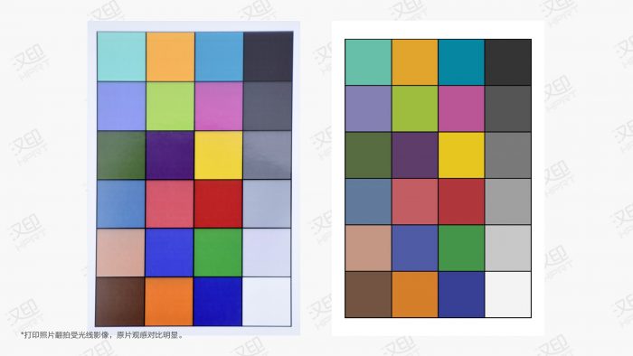 为了进一步测试它的色彩还原准确性,我找到一张之前测手机屏幕色准的色板图片用CP4000打印出来,与原图对比不难看发现多数颜色的还原还是比较准确的, 只有第一排的青色有些偏差。