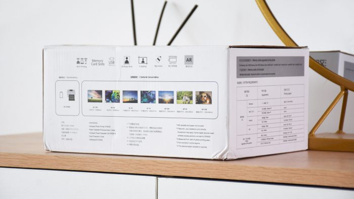 盒子背部罗列有包装内容以及这台照片打印机支持打印的照片尺寸,常见的卡片、5寸相纸和明信片都可以打印,具体后面的体验环节再详细讲。