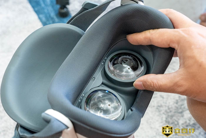眼镜的边缘有厚厚的海绵包裹,可以看到两个目镜的中间有红外传感器,可以根据传感器感应到我有没有佩戴这个VR一体机。从而自动开机激活或是关闭省电,用起来简单又贴心。