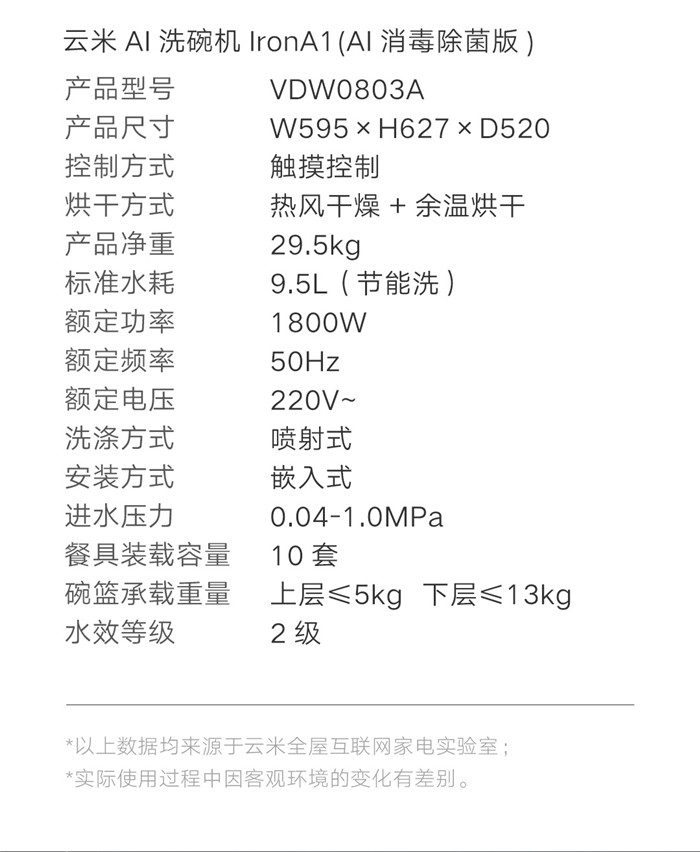 云米AI洗碗机IronA1(AI消毒除菌版) 10台