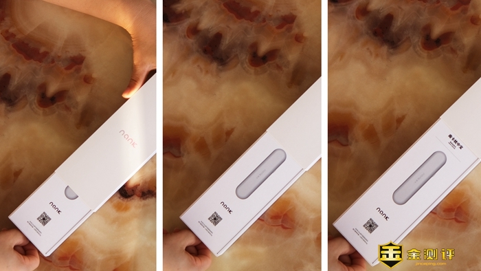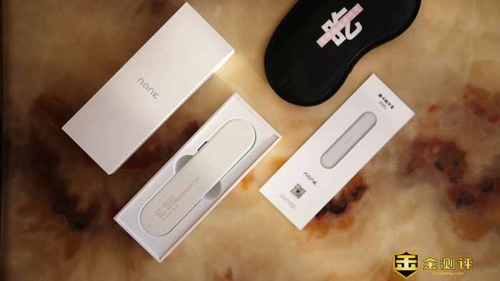 南卡枕中宝采用抽拉式包装设计,捏住银灰色的拉带,就可以抽出内包装盒,直接进入眼帘的是用户使用手册,伴随一段段地拉出,彩色的产品渲染图慢慢展现眼前,直至看到南卡枕中宝几个大字。