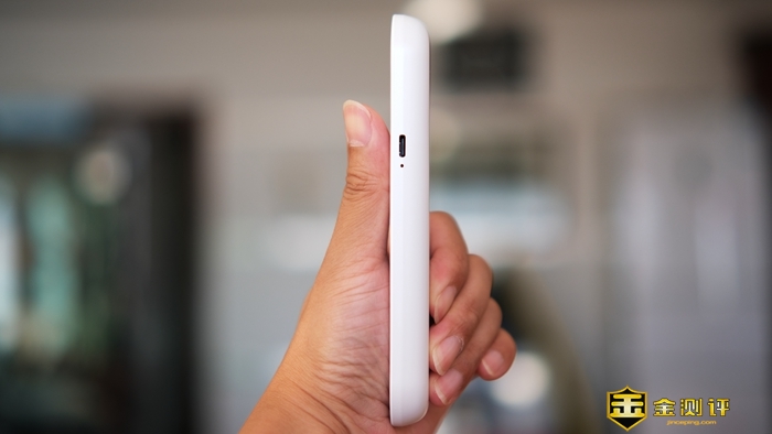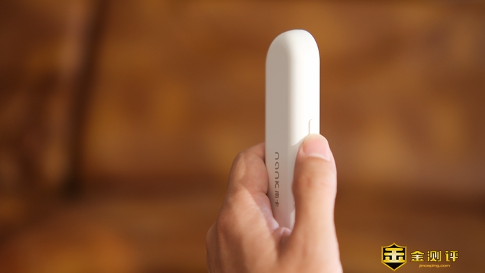 机身下方是充电口,旁边是一个贯穿的指示灯孔,充电时红色灯光会从中间穿透出来,充满时则会蓝色长亮。顶部是全机身唯一一个实体按键——开关键,按压时回弹力度适中。