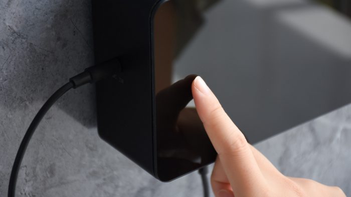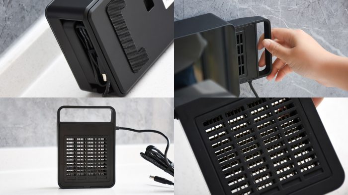 接着把估计挂到背架上就完成了安装,很简单。黑色镜面面板看上去丝毫不显廉价感,与多数厨房环境搭配也很和谐,甚至莫名有种高级感。整个机身包括净化仓采用的都是食品级的ABS材质,可以放心的和食品接触,安全无害。