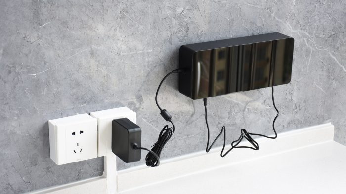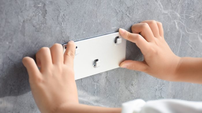 先将背架与墙面固定好,可以用四个螺丝固定,如果厨房做了瓷砖墙面的话可以用附赠的3M胶粘贴。这里要注意安装的高度,通常厨台后面还有凸起的一段挡水条,要确保主机可以挂上去,并且主机下方的插孔可以正常插进去线。