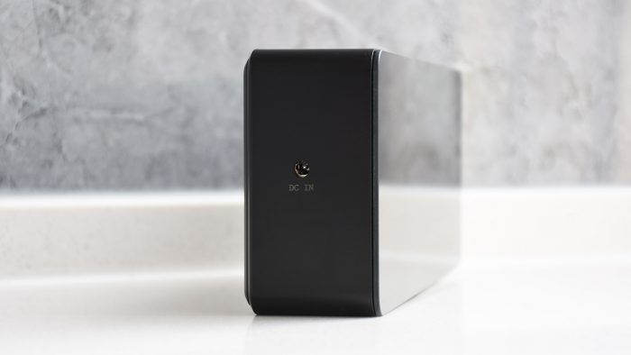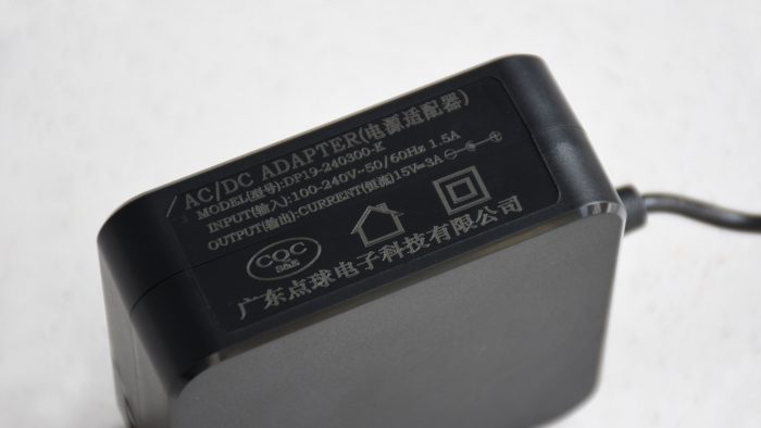 机身左侧预留有DC电源接口,用来和电源适配器连接供电。适配器的体积也不算太小,插头部分采用可折叠设计,且适配器整体是纵向形态,不会占用过多的插座空间,输出功率是15V-3A。
