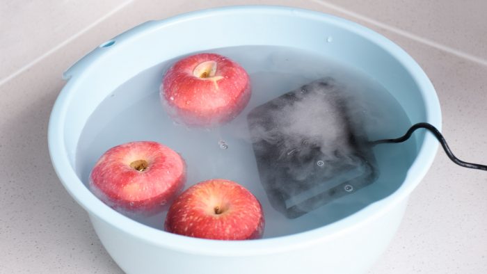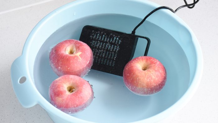 整个清洗杀菌的过程完全依靠电解,不添加任何添加剂,不会产生二次污染。找到几个中秋节买的苹果放到洗菜盆里,然后进行电解清洗,清洗完以后可以看到盆中的清水稍微变得浑浊,这说明通过电解清洗把苹果表面的污渍和细菌完全分解了出来,包括一些不溶于水的残留物质。
