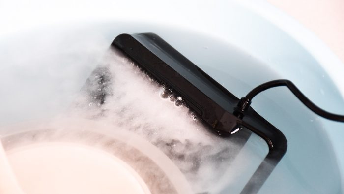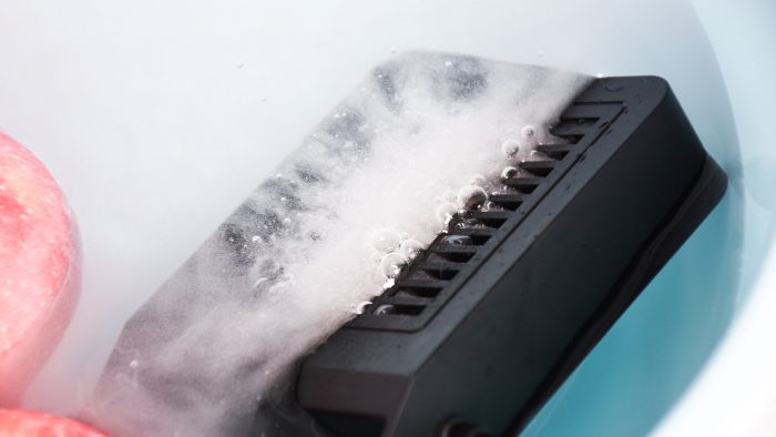 净化仓延伸出来的线材需要和机身底部的DC插孔连接起来,同样是供电的作用。不得不说,分体式的设计确实方便了很多,不仅机身体积比洗碗机式的设计小巧精致了很多,使用起来也很方便,可以直接把净化仓丢到洗菜盆里,也可以放到自己的塑料盆里,场景不受限。