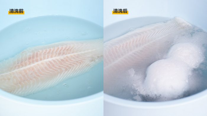 果蔬尚且如此,肉类当中也含有瘦肉精等有害物质,过量摄入人体会导致中毒。以我平时爱吃的龙利鱼来说,把鱼泡在盆里,然后把净化仓丢进去,经过15分钟的清洗,水面上出现了大量含有激素、血水和杂质的白色浮沫,把附着在鱼肉中的有害物质完全分解出来。