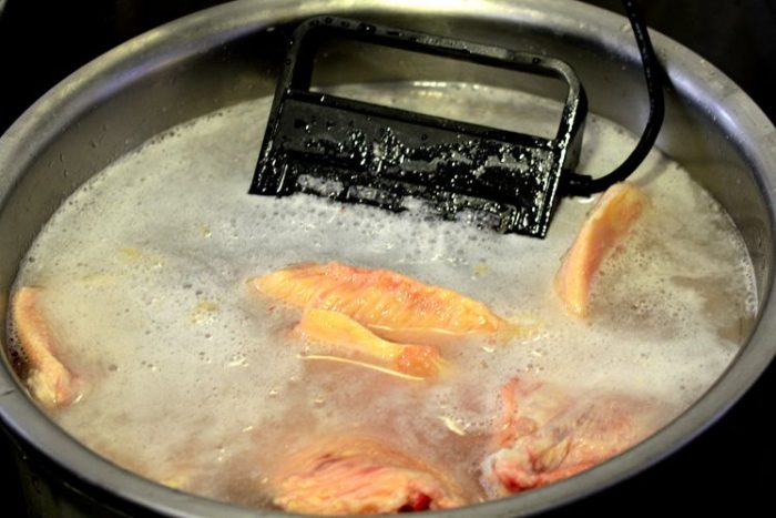 净化仓体积紧凑,不挑容器,水盆、水槽里面都能使用,并且活动范围很大,在厨房这种下载的空间使用起来很灵活。净化机所产生的次氯酸,可以通过氧化反应中和肉类中的廋肉精、抗生素等有害物质,经过15分钟净化之后,水面漂浮着很多的污物,鸡翅干净了许多,这样的食物吃起来更健康,也更放心了。