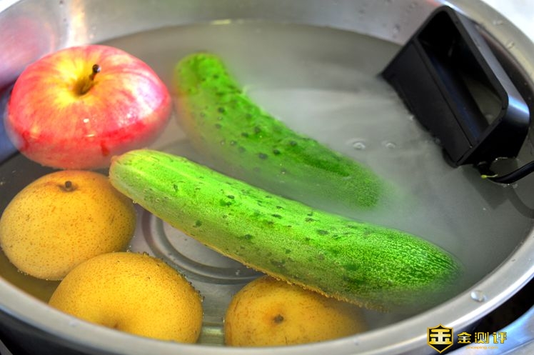 净化机利用电解作用,产生氢气和氢氧根,来中和果蔬上面的农药残留。净化仓在水里会产生大量的气泡,因为它气泡抗凝技术,在食材表面形成超空泡效应,起到净化效果。就算果蔬的表面凸凹不平,它的净化效果也是一样的,比手洗要彻底。