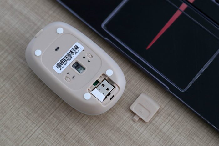 咪鼠S5B鼠标的底部下方隐藏设计了一个接收器收纳仓,通过上下移动就可以轻松打开、关闭,平时使用时将接收器取出,使用完后放在收纳仓,可以有效避免意外丢失接收器的情况发生。