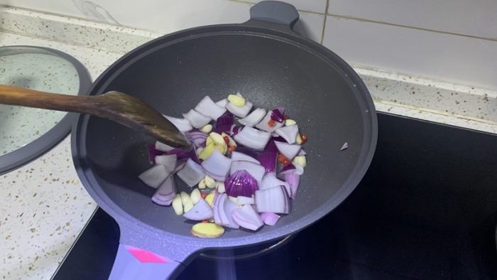 同时分享一下这道好吃又好做,就是有点费锅的菜吧。先把洋葱、大蒜用油轻轻炒一下,然后把火关上,进行下一步重要的操作~~