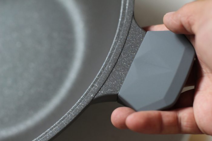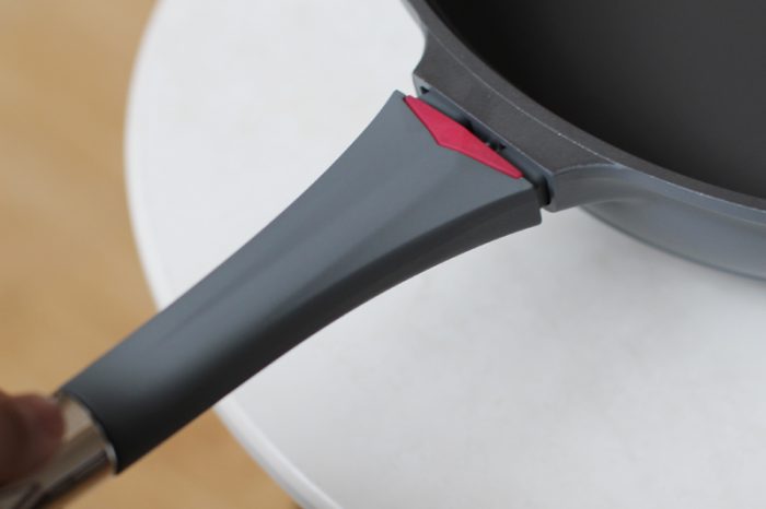 如果锅的手柄像普通锅一样难以拆卸,那么更换锅耳也就失去了意义。帝伯朗菲尼雅浮雕钛钻多用不粘锅采用了“顶珠”设计,手柄拆卸非常简单,就算女生也可以轻松完成。