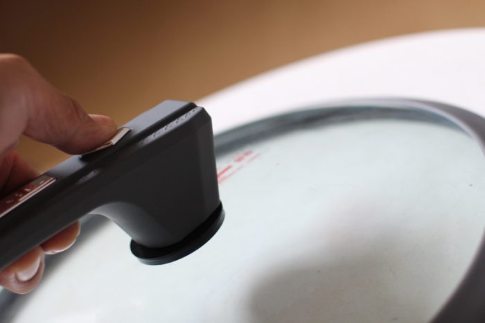 这款帝伯朗菲尼雅浮雕钛钻多用不粘锅最大的黑科技其实就在锅盖上,锅盖的周边有一圈硅胶密封圈,盖上以后就形成了一个高压环境,然后在提手这里有一个泄压阀门,按下后锅里压力减小,热气排出。这个功能可以有效的缩短食物烹制时间,这个后面详细说。