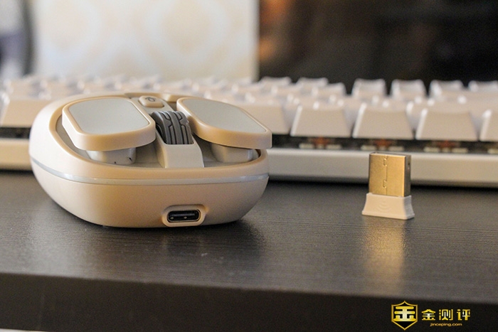 MiMouseS5B的外观设计非常别致,个人感觉整个外形有种类似之前抖音推送的运动健身器外形差不多。机身线条圆润,扁平设计,提升了鼠标的握持感。鼠标的按键区域刚好是个长方形,鼠标机身为左右对称设计,左右手都可以使用,机身采用了亲肤材质、表面丝滑、手感细腻。滚轮使用的是类似法拉利跑车轮胎。MiMouseS5B的使用充电式设计,前端是一个Type-C的接口用来给鼠标提供电力续航。内置450mah电池,正常可以使用一个月以上,在馈电状态支持边充边用,不影响正常使用。相比以往2.4G无线鼠标铅酸电池MiMouseS5B更家的节能环保。