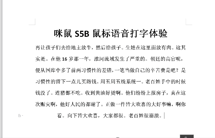在写这篇体验前我特意去搜索了下键盘输入最快每分钟能打多少字,百度给出的结果是一般文员类工作者每分钟能做到60~80字,在专业的能达到200左右,普通人仅仅能够做到50左右,用鼠标颠覆传统输入基于科大讯飞的语音技术,按下咪鼠S5B语音键语音输入即可转换成文字,一分钟可输入400字而且识别准确率达98%,按住语音键说话,说完松开,只需按住语音键就能快速地输入文字,轻松解放双手从此告别键盘打字,轻松超过专业人士。