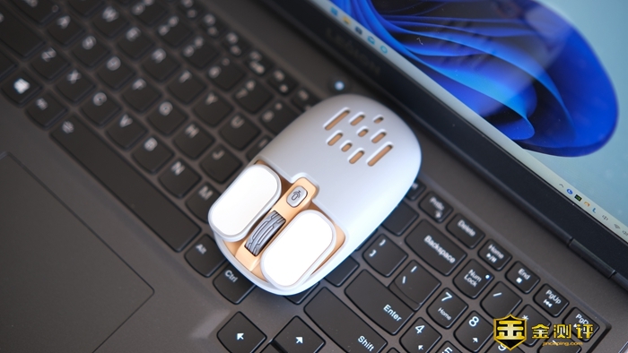 在鼠标机身掌心对应的位置有9个不同尺寸的条形挖孔,让这款鼠标看起来多了几分灵动,搭配内部米色的机身,让它看起来更像一只忙碌的小蜜蜂。