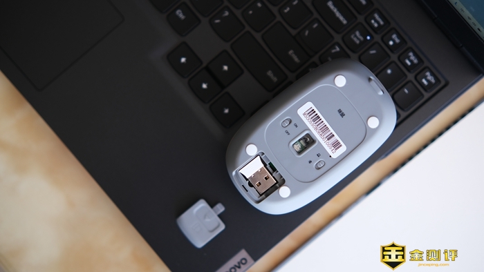 鼠标底部前端是Type C充电口,在中间光电传感器四周,各有一个白色脚垫,可以让S5B挪动的时候更加顺滑;光电传感器左右分别是相互独立电源开关和模式切换键,并且印有明确的功能标识。