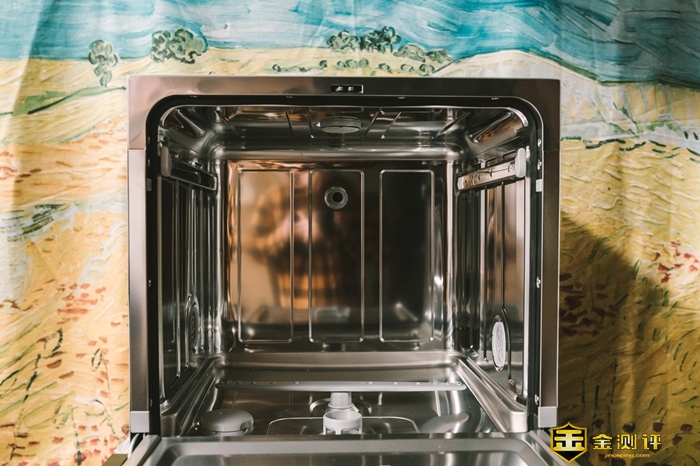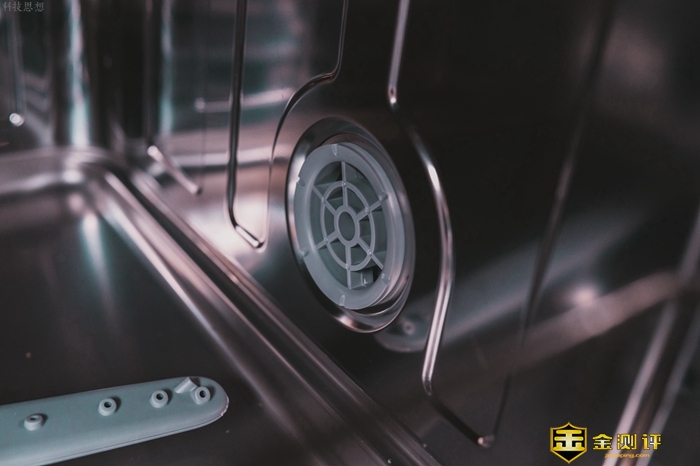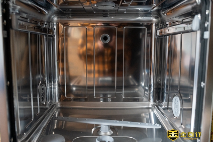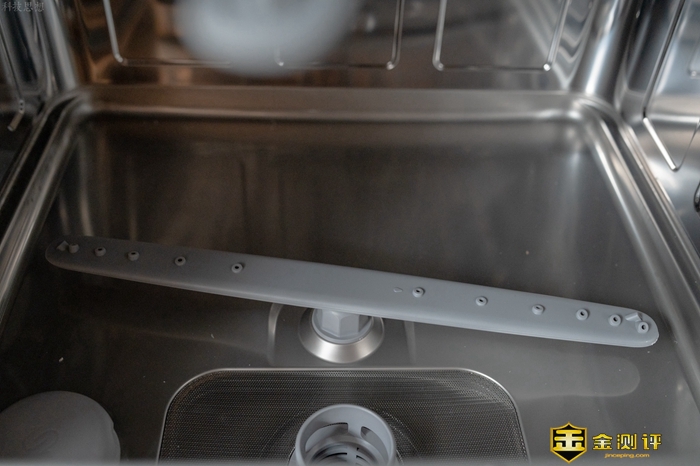 这款洗碗机的内胆是不锈钢材质的,而且高度为460mm,容积不小,和塑料之类的材质相比,具有更强的耐高温表现,另外可以看到,云米AI洗碗机Iron A1内胆的做工很不错,表面光滑平整,基本找不到缝隙,因为拼接处都采用了拼接处采用 TOX 铆接咬合工艺,洗碗后的污水都会通过底部带过滤器的水槽流出。