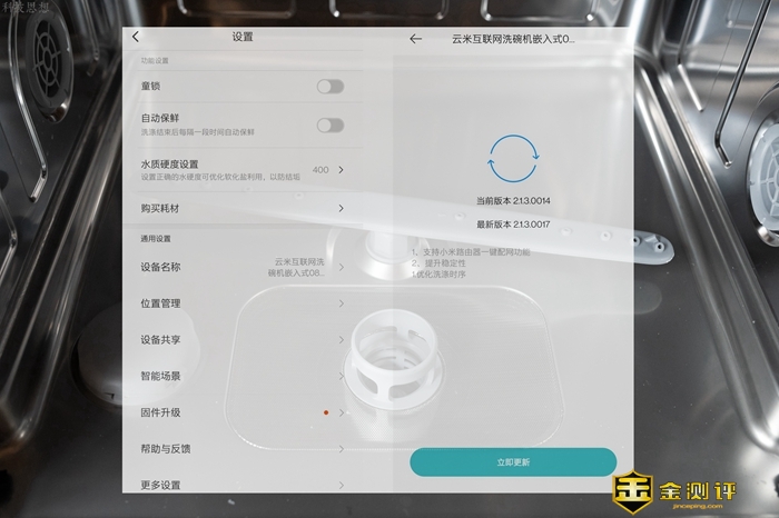 此外在使用软化盐时,我们也能够通过APP的地区设置功能,找到推荐的水硬度值,从而获得更好的清洁效果。另外云米AI洗碗机Iron A1的固件升级也是通过米家APP来完成的。平时如果有缺少软化盐、漂洗剂之类的情况,米家APP上也能看到明显的提醒。