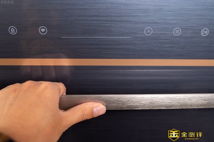 这款洗碗机正面的玻璃门通过一根全铝合金把手打开,这根把手的做工也很精细,而且开关门的时候都很顺滑,而且把手的防滑表现也不错,湿手开关也没问题。