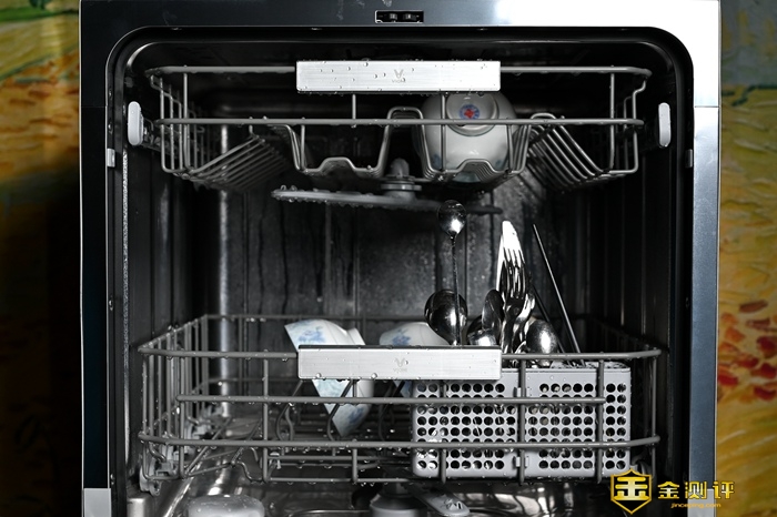 打开洗碗机之后,可以看到两层碗篮,因为云米的家电主打国内市场,所有这款洗碗机也是针对中式餐具做了优化,上下两层一共可以放下74件标准餐具,也就是八菜一汤的配置,节庆期间聚餐之后可以轻松清洁满桌的餐具。