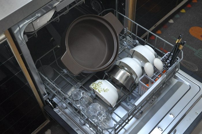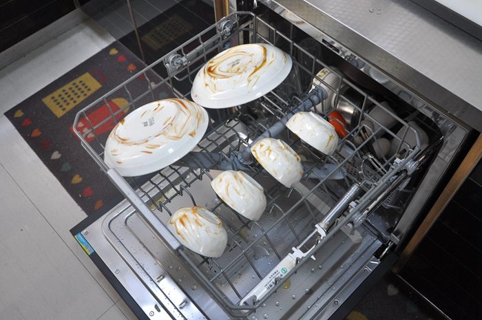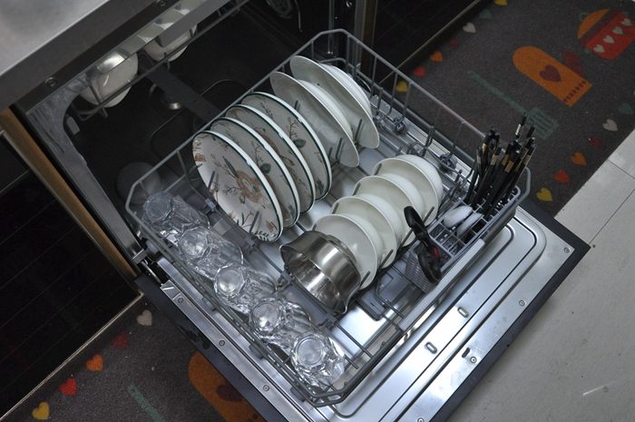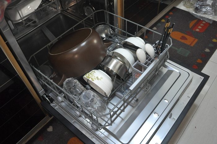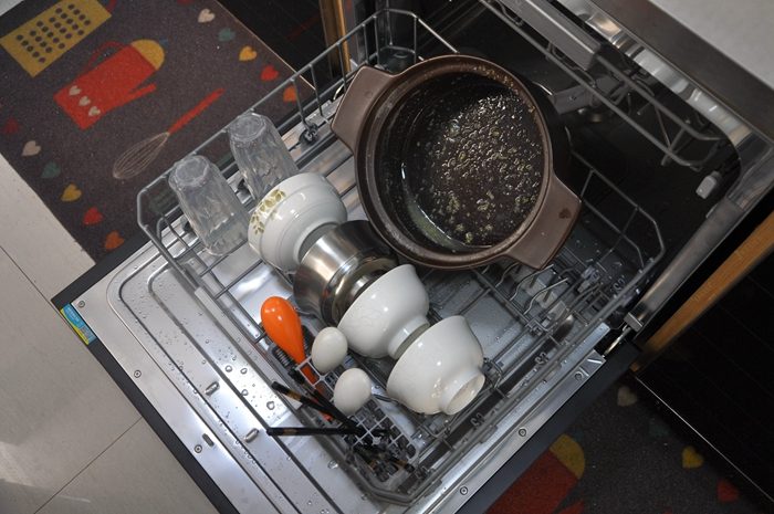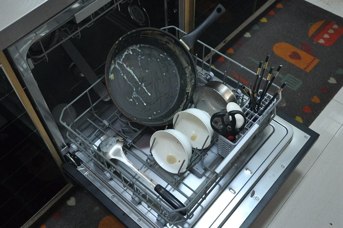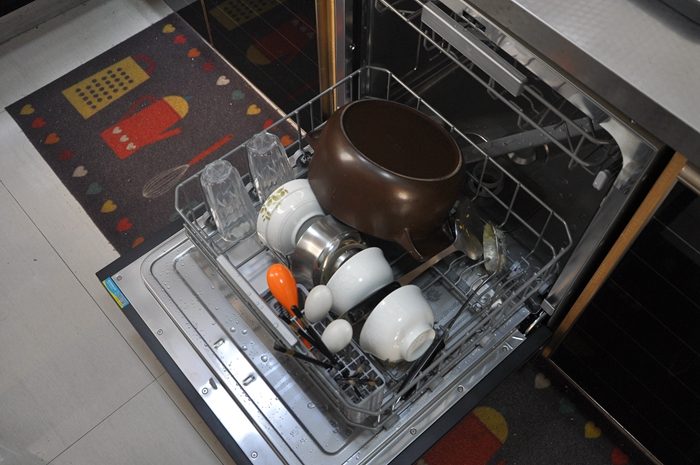 ▼好不好用当然要试过才知道,装好后的第一餐我们用砂锅熬了玉米糁,在下碗篮中放入砂锅、水杯、碗筷和勺等餐具,可以看到无论是砂锅、勺子还是铲子上都粘有大量已经凝固的食物残渣。上碗篮中放有两个深盘、四个小碗和两把削皮刀,碗盘表面我都涂抹有大量蚝油和番茄酱,两把削皮刀上有厚厚的污渍。需要注意的是把餐具放入洗碗机前需要像我这样先把大块的食物残渣清理掉,这样就不用重复清理过滤组件啦,要正确摆放碗碟才能洗得更干净彻底。